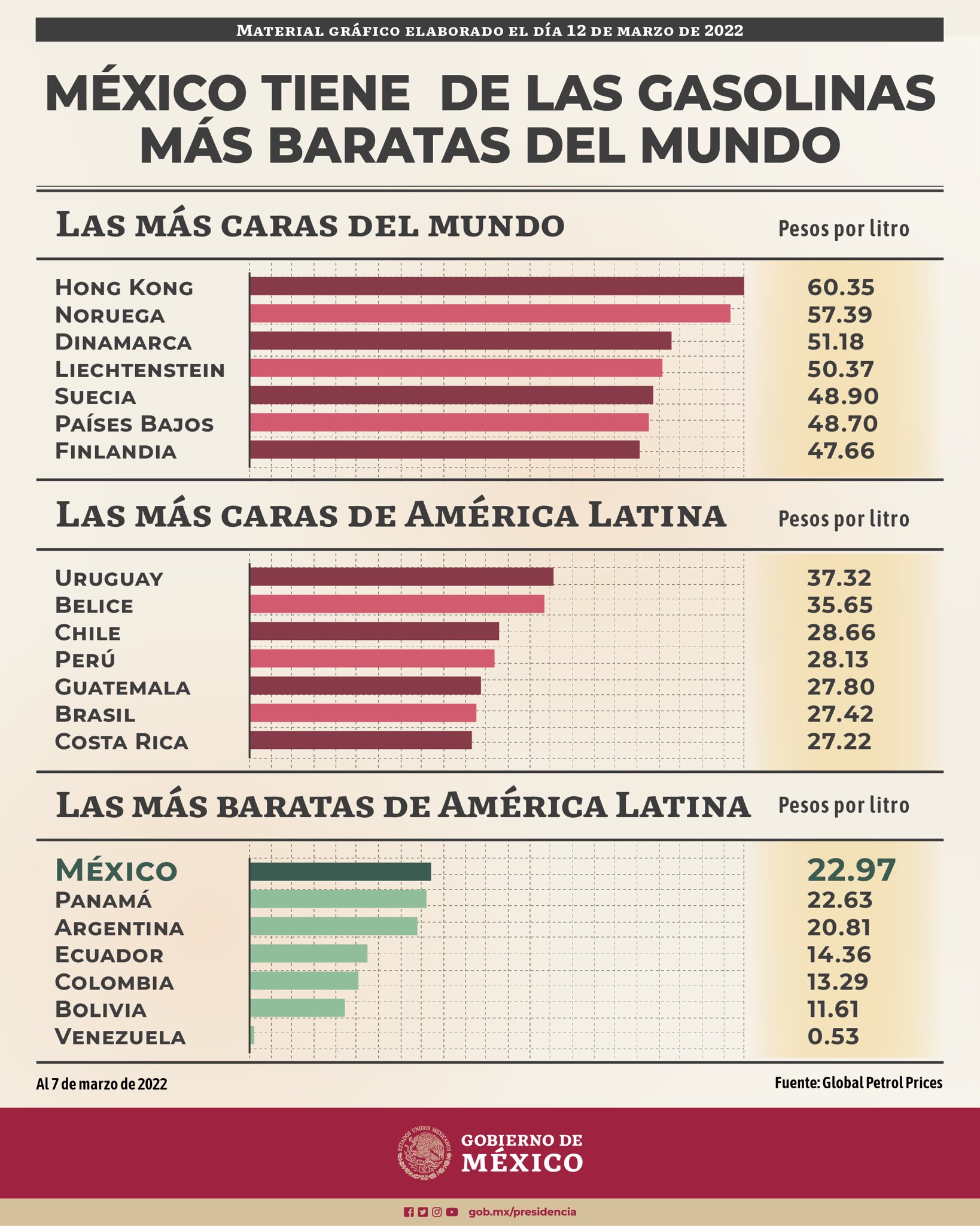 “En nuestro país, el promedio de la gasolina es 22.97 pesos por litro y el precio global alcanza los 27.58 pesos»