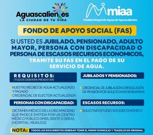 El Modelo Integral de Aguas de Aguascalientes (MIAA), recuerda a los usuarios adscritos al programa del Fondo de Apoyo Social (FAS), que refrenda su disposición con los sectores de mayor vulnerabilidad para que sigan recibiendo este beneficio.