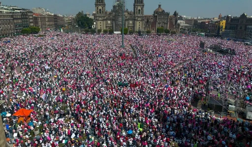 En la Ciudad de México el domingo, miles de personas vestidas de rosa acudieron en masa al Zócalo gritando “fuera López”. Otras llevaban carteles que decían “el poder de la gente es más grande que la gente con poder”.