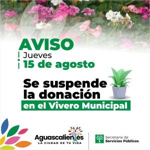 La Secretaría de Servicios Públicos del Municipio de Aguascalientes da a conocer que con motivo de los festejos a la Virgen de la Asunción, este jueves 15 de agosto no se llevará a cabo la donación de plantas y árboles en el Vivero Municipal.