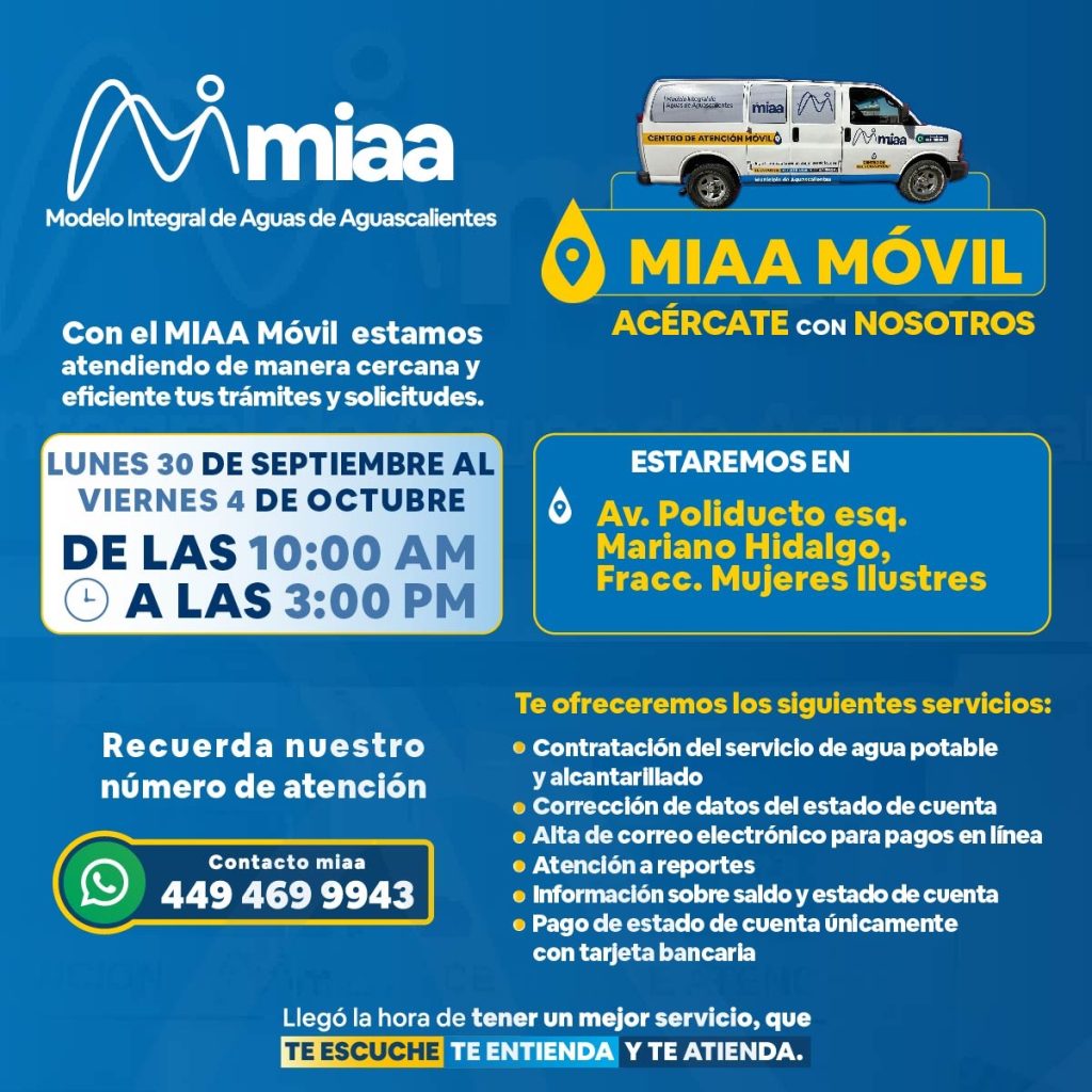 Con la finalidad de continuar dotando de un servicio cercano a los usuarios del agua potable y alcantarillado del municipio, el Modelo Integral de Aguas de Aguascalientes (MIAA), sigue visitando diversas colonias y fraccionamientos a través del MIAA Móvil.