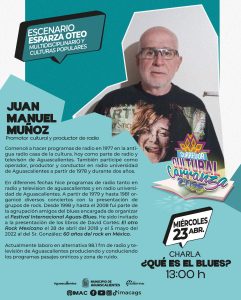 Como cada año, el Instituto Municipal Aguascalentense para la Cultura (IMAC) ofrece una serie de charlas y clínicas musicales, dentro de las actividades del Corredor Cultural Carranza. En esta edición 2025, el ciclo iniciará este miércoles 23 de abril a las 13:00 horas, con la charla “¿Qué es el Blues?”, a cargo del promotor cultural Juan Manuel Muñoz, en el escenario Esparza Oteo, a un costado del Museo Regional.