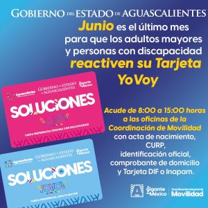 Durante el mes de junio adultos mayores y personas con discapacidad podrán reactivar o tramitar por primera vez la Tarjeta Soluciones YoVoy, la cual les otorga un descuento del 50 por ciento en la tarifa del transporte urbano.