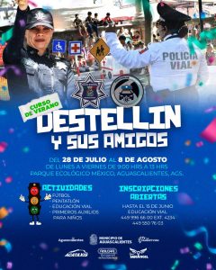 El Municipio de Aguascalientes, a través de la Secretaría de Seguridad Pública Municipal invita a los padres de familia a inscribir a sus hijos de entre 10 y 12 años de edad a participar en el curso de verano “Destellín y sus amigos”, una iniciativa que busca fortalecer, desde la infancia, una cultura vial basada en el respeto, la responsabilidad y el conocimiento de las normas de tránsito.