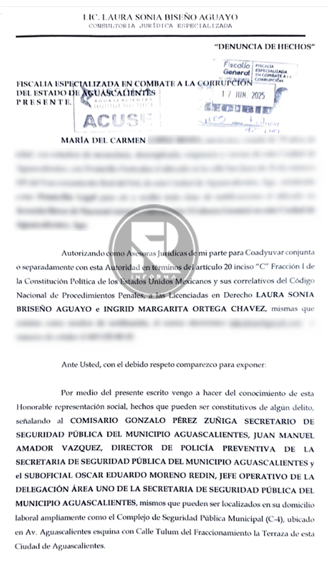 La denuncia penal fue presentada en la Fiscalía Anticorrupción de Aguascalientes en contra del Sub Oficial Óscar Eduardo Moreno Redin, Jefe Operativo de la Delegación Área Uno, Comisario Gonzalo Pérez Zúñiga Secretario Seguridad y Juan Manuel Amador Vázquez, Director de Policía Preventiva, todos integrantes de la Secretaria de Seguridad Pública del Municipio Aguascalientes.