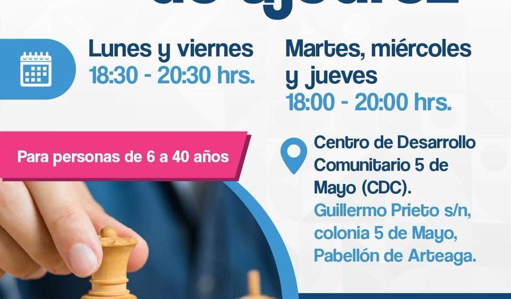 Redacción; ♟ Escuela de Ajedrez ¡Activa tu mente y desarrolla tu concentración jugando ajedrez! 🧠♟ Participa en nuestra Escuela de Ajedrez, dirigida a personas de 6 a 40 años. Mejora tus habilidades lógicas, estratégicas y diviértete aprendiendo con nosotros. 📍Centro de Desarrollo Comunitario 5 de Mayo 🗓 Lunes y viernes | 18:30 a 20:30 hrs […]