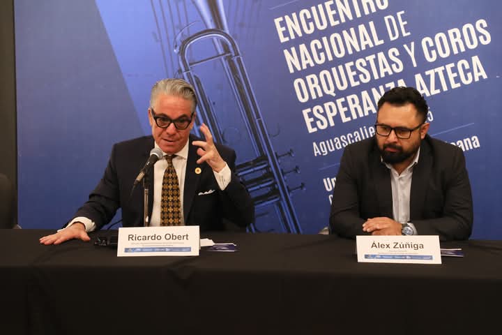 En la rueda de prensa estuvieron presentes Ricardo Obert Martínez, director general del Sistema Nacional de Coros y Orquestas Esperanza Azteca; Jorge Enrique Franco López, vicerrector general de la Universidad Panamericana campus Aguascalientes; y Sonia Liceaga, directora del Programa Social de Orquestas y Coros Esperanza Azteca.
