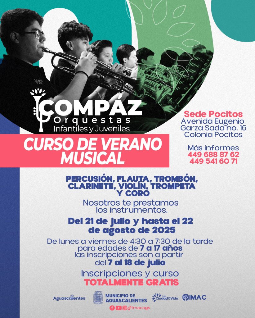 Iván Sánchez Nájera, titular del Instituto Municipal Aguascalentense para la Cultura dijo que se ha preparado el curso de verano musical “Orquestas Compáz” en la sede Pocitos, para contribuir a la formación musical de niñas, niños y jóvenes para promover el aprendizaje de instrumentos en un entorno creativo, accesible y gratuito.