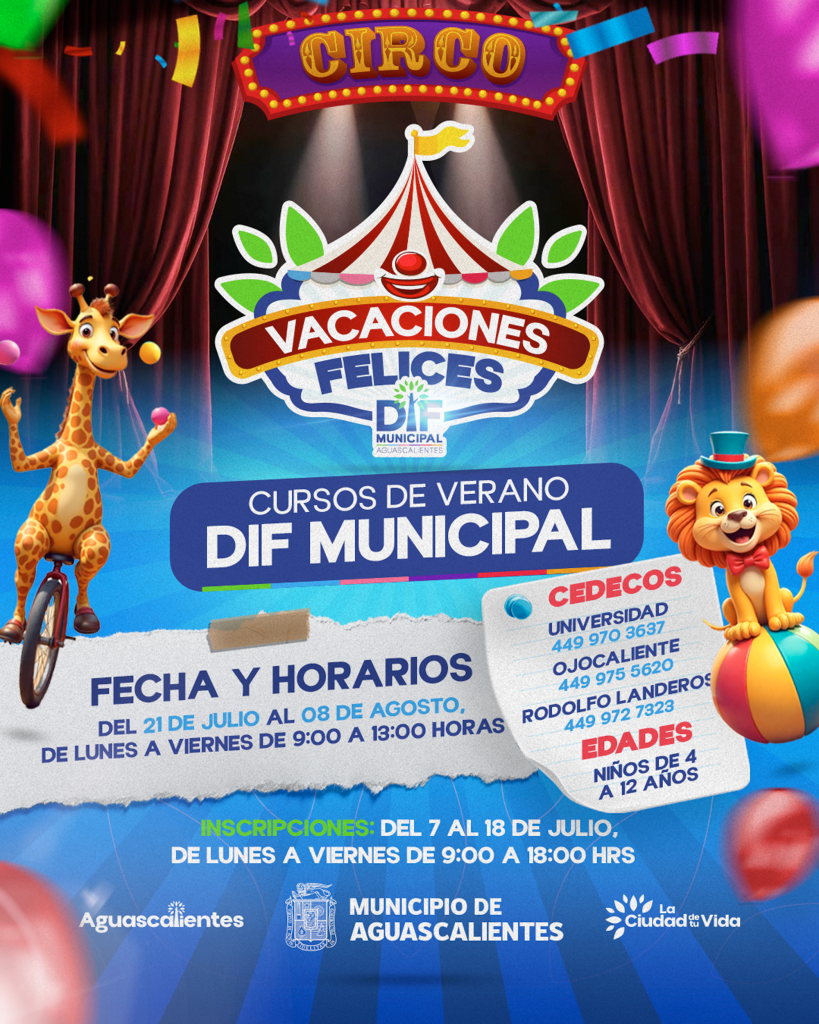 El titular del DIF Municipal, Héctor Hugo Aguilera Cordero destacó que la dependencia a su cargo cumple 35 años de realizar el curso “Vacaciones Felices”, el cual está dirigido a niños de 4 a 12 años de edad, se realizará del 21 de julio al 8 de agosto, en un horario de 9:00 a 13:00 horas, con actividades deportivas, recreativas, repostería, manualidades, Lenguaje de Señas Mexicana, entre otras. Cuenta con tres sedes: Universidad, Ojocaliente y Rodolfo Landeros. El costo del curso de verano en Universidad es de 775 pesos por niño, mientras que en los cedecos de Rodolfo Landeros y Ojocalientes es de 124 pesos por niño. Las inscripciones son del 7 al 18 de julio, de lunes a viernes, en un horario de atención de 9:00 a 18:00 horas. Para mayores informes pueden marcar a los teléfonos 4499703637 de Universidad, 4499755620 de Ojocaliente y 4499727323 de Rodolfo Landeros.