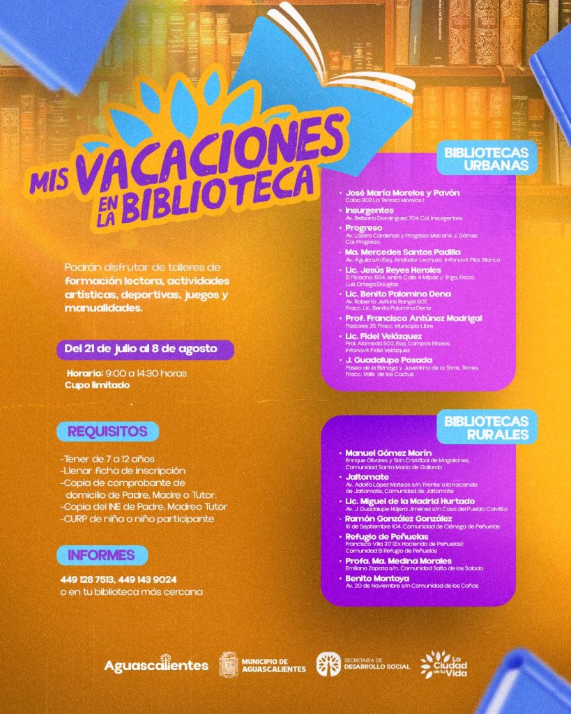 Asimismo, detalló que también se tiene el curso “Mis Vacaciones en la Biblioteca”, que se lleva a cabo en las 16 bibliotecas municipales urbanas y rurales, con el objetivo de fomentar la lectura, desarrollar habilidades de comunicación y trabajo en equipo en los menores de edad, estos cursos son sin costo, se impartirán del 21 de julio al 8 de agosto, de lunes a viernes, en un horario de 9:00 a 14:30 horas, para niños de 7 a 12 años de edad. Para mayores informes, los interesados se pueden comunicar a los teléfonos 4491287513 y al 4491439024.