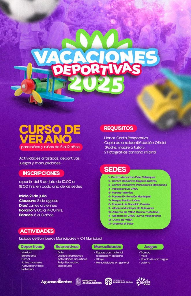 Christian Gutiérrez Márquez, secretario de Desarrollo Social Municipal dijo que la Sedesom ofrece a la ciudadanía dos cursos de verano “Vacaciones deportivas en la Ciudad de tu Vida”, dirigida a niñas y niños de 6 a 13 años de edad, se llevará a cabo del 21 de julio al 8 de agosto, este curso es gratuito, ofrece actividades deportivas, recreativas y artísticas en 13 sedes, entre centros deportivos y parques del municipio capital, en un horario de 9:00 a 14:00 horas, de lunes a viernes. Las inscripciones están abiertas a partir del 8 de julio, de 10:00 a 18:00 horas.