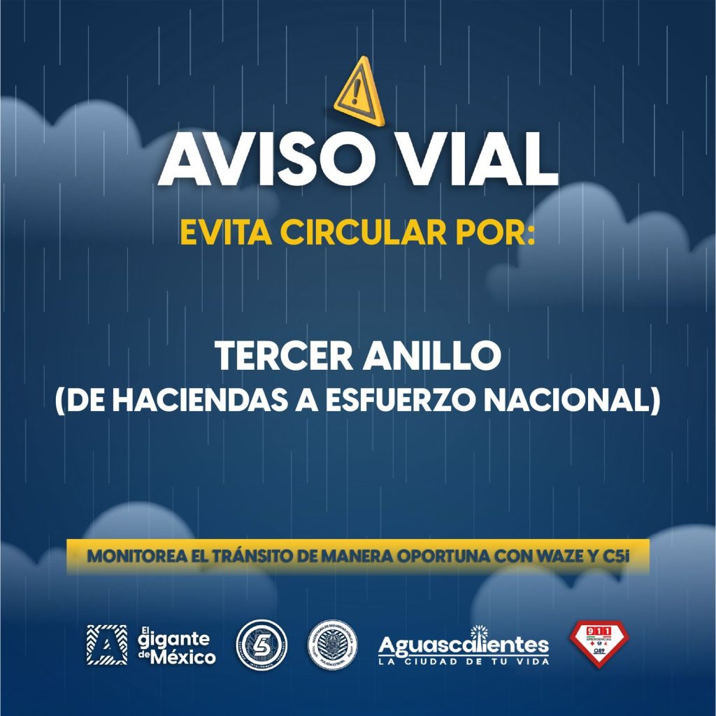⚠️ AVISO VIAL ⚠️ Debido a las intensas lluvias, algunas vialidades pueden verse afectadas. Evita circular por: 🚧 Tercer Anillo oriente – De Haciendas a Esfuerzo Nacional Recuerda monitorear el estado del tráfico en la app Waze o en el C5i. Si tienes una emergencia comunícate al 911.