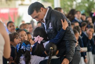 Acompañado de Christian Gutiérrez Márquez, secretario de Desarrollo Social y de Rafael Esqueda Medina, director de este plantel, Leo Montañez hizo entrega de equipo deportivo para fomentar la actividad física de los alumnos de esta primaria.