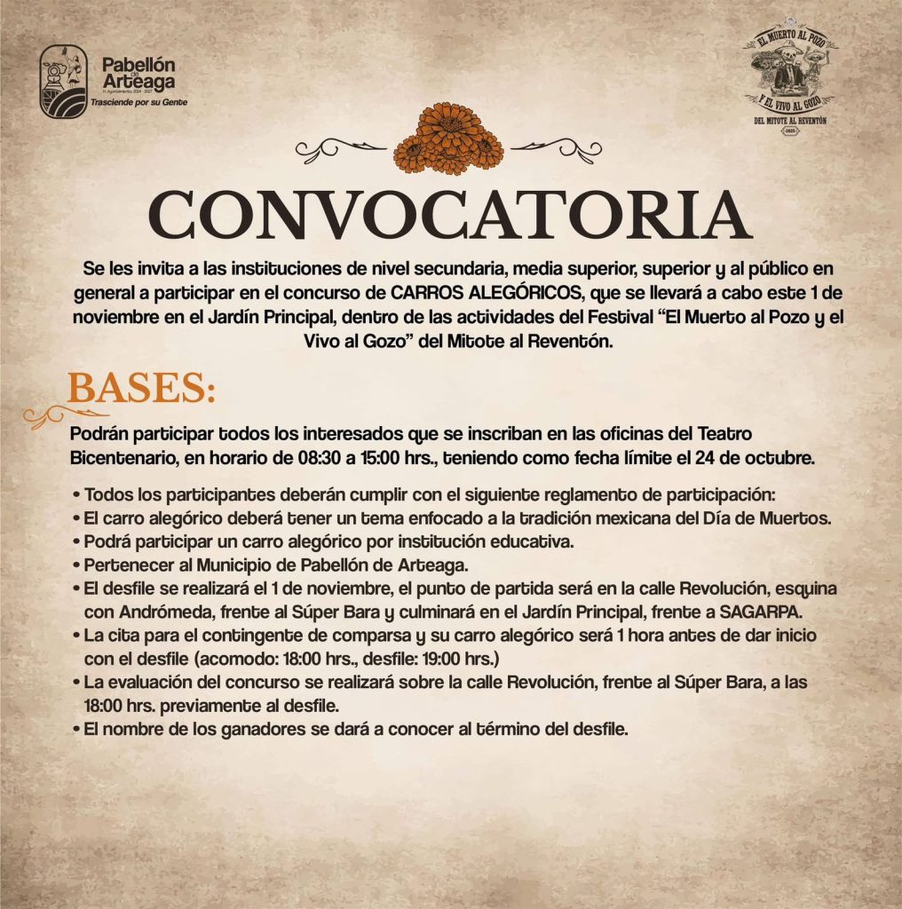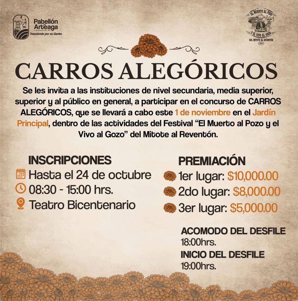 Te invitamos a participar en el Concurso de Carros Alegóricos, este 1 de noviembre a partir de las 19:00 horas, como parte del gran desfile de “El Muerto al Pozo y el Vivo al Gozo”.