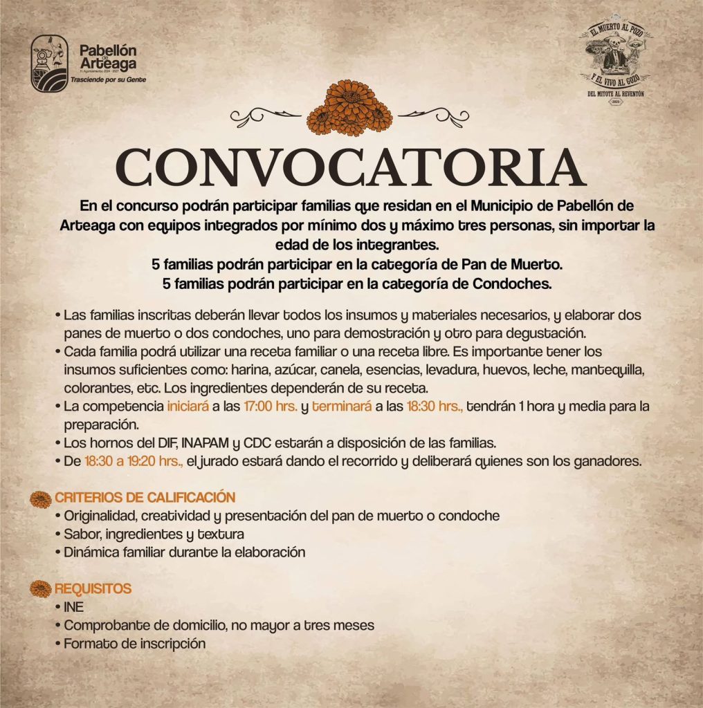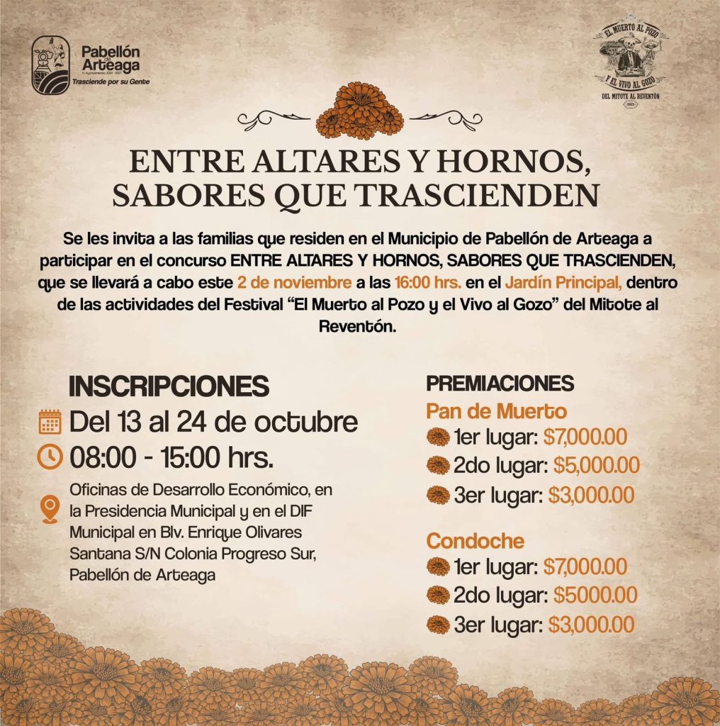 Te invitamos a participar en el concurso “Entre Altares y Hornos, Sabores que Trascienden”, donde las familias de Pabellón compartirán el arte de elaborar pan de muerto y condoches con el toque único de nuestras raíces.