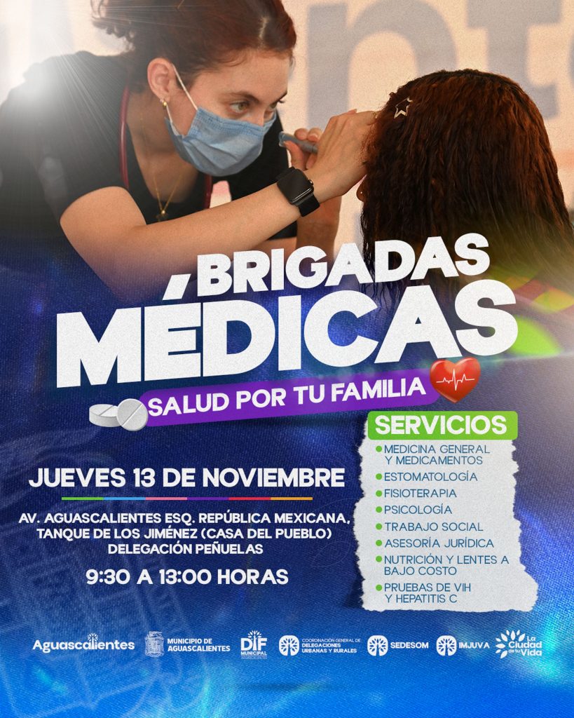El DIF Municipal de Aguascalientes continúa acercando servicios de salud gratuitos a las familias de la capital, a través de sus Brigadas Médicas “Salud por tu Familia”, las cuales se llevarán a cabo los días martes 11 y jueves 13 de noviembre.
