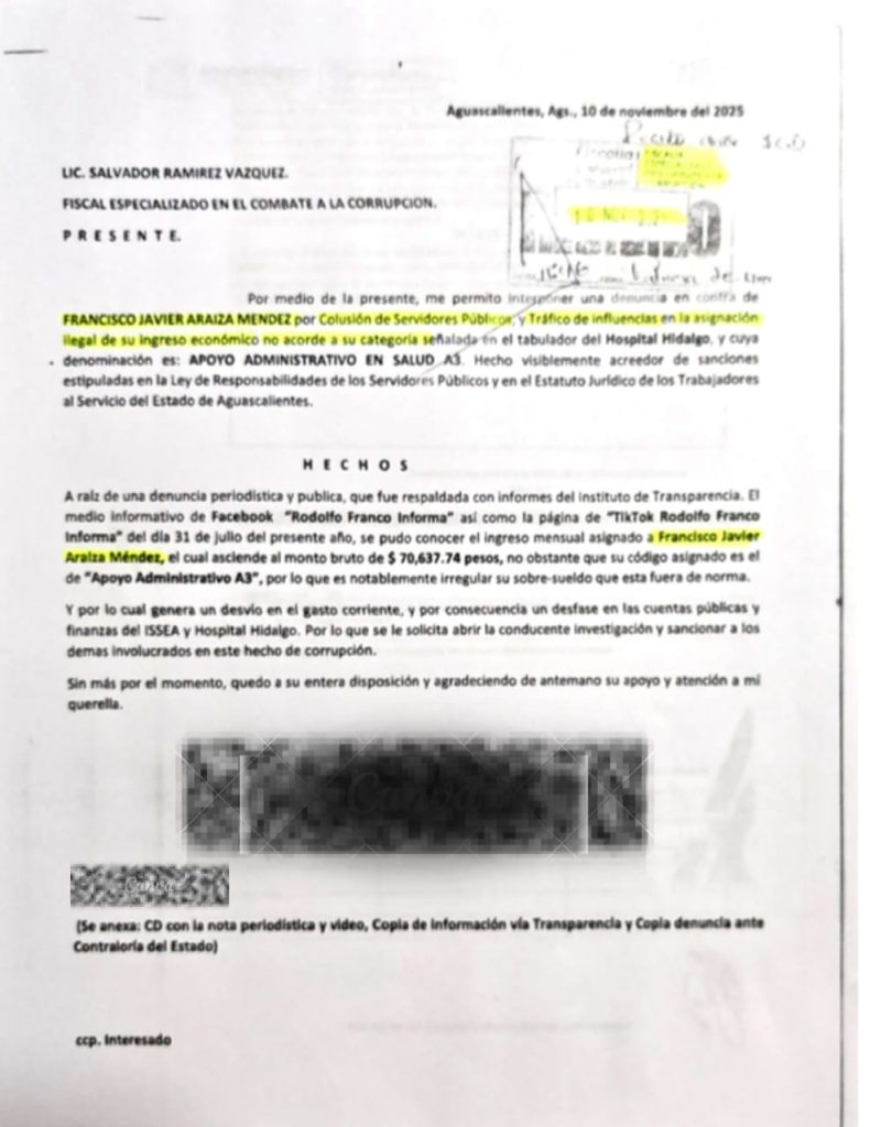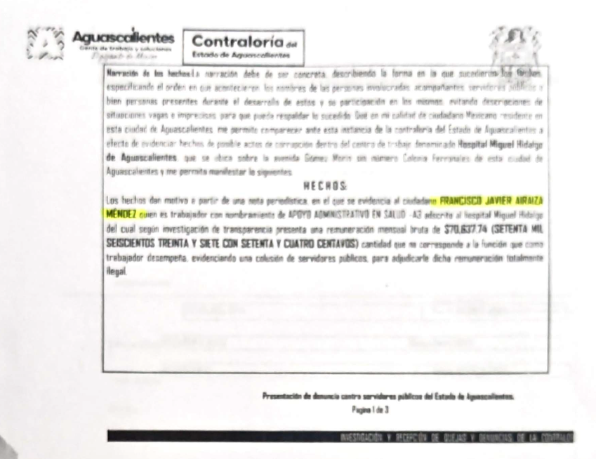 Francisco Javier Araiza Méndez, líder del sindicato de trabajadores del Centenario Hospital Miguel Hidalgo fue denunciado penalmente ante la Vice Fiscalía Anticorrupción del estado de Aguascalientes y en la Contraloría del Estado.