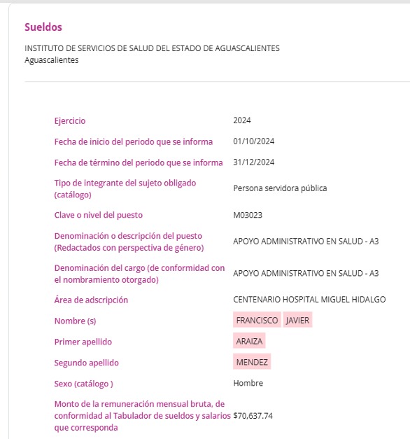 Otro agravante expresado en la denuncia, es el doble ingreso que tiene en el Municipio de Jesús María, donde cobra 9 mil 846 pesos con 78 centavos por un cargo como Operativo C III en la Secretaría de Administración, por lo que en total percibe 80 mil 484 pesos con 52 centavos.