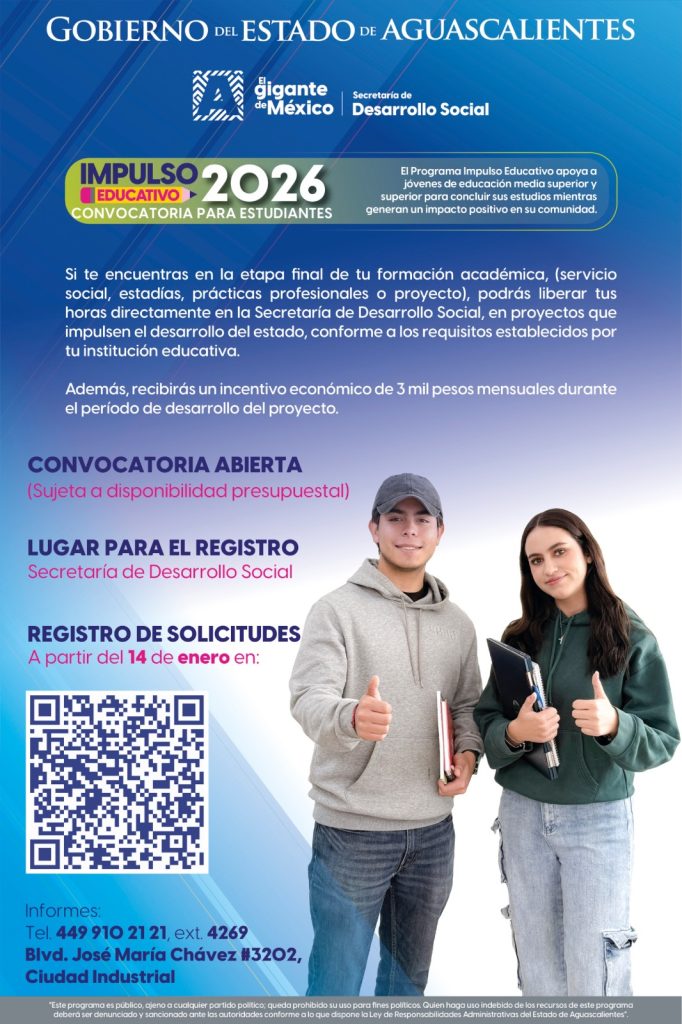 ¿Estás por terminar la prepa o la universidad y buscas una oportunidad para ganar experiencia, apoyar a tu comunidad y recibir un apoyo económico? Impulso Educativo está diseñado para jóvenes de Aguascalientes que quieren dar el siguiente paso en su formación académica y profesional.